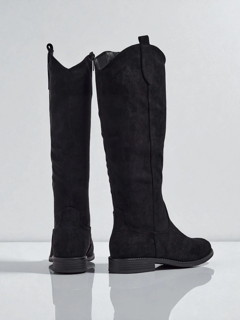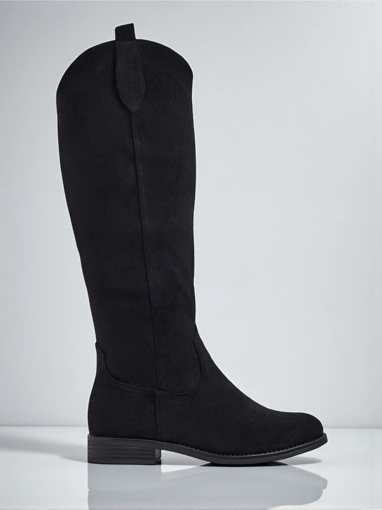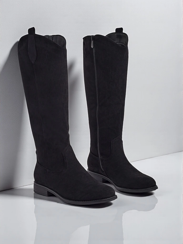 - Stylish women's knee-high boots with a flat sole. The upper is made of eco-suede leather, with fur lining inside. The model is fastened with a zipper. Perfect for everyday autumn outfits!
