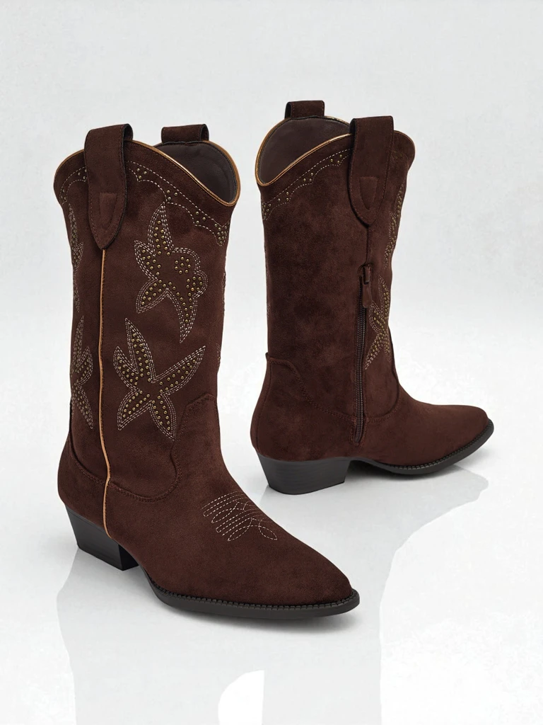 Te eleganckie buty cowboy wykonane są z wysokiej jakości zamszu, co zapewnia komfort i trwałość. Zamsz, znany ze swojej miękkości i elastyczności, jest materiałem, który idealnie dopasowuje się do stopy, zapewniając wygodę podczas długiego noszenia. Dodatkowo, buty są ozdobione pięknym kwiatowym wzorem, co nadaje im wyjątkowego charakteru.