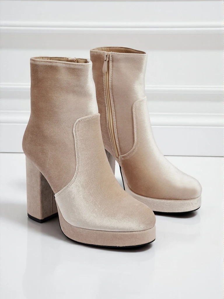 - Comfortable heeled ankle boots, made of a velour-like fabric. The model fastens with a zipper. It has a delicate lining in the form of fur. An ideal choice for autumn!