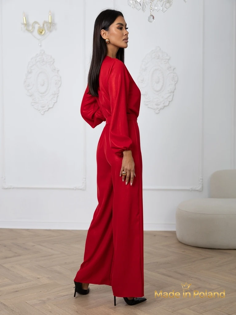 - Elegant women's jumpsuit made of pleasant fabric with a glitter thread. Top with a wrap neckline and long sleeves. Wide legs with elastic at the waist. Additionally, a belt. Perfect for those who value comfort.