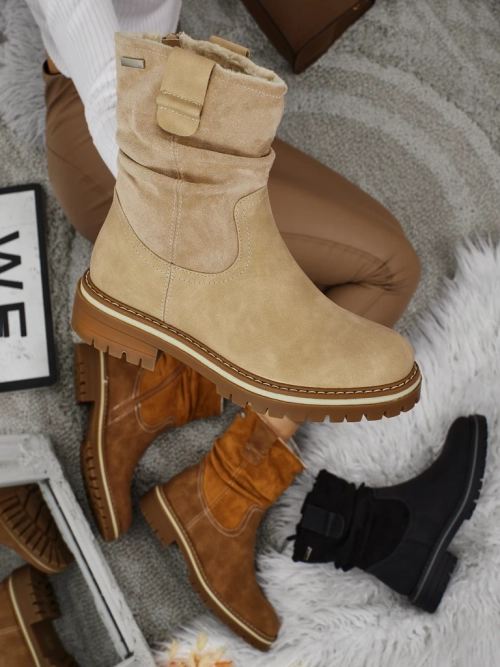 - Damskie botki zapinane na zamek. Model wykonany ze skóry ekologicznej zamszowej, na płaskiej podeszwie. Posiada ocieplenie a'la futerko. Zdobione lekko marszczoną cholewką. Wygodny i stylowy, idealny na jesień!
