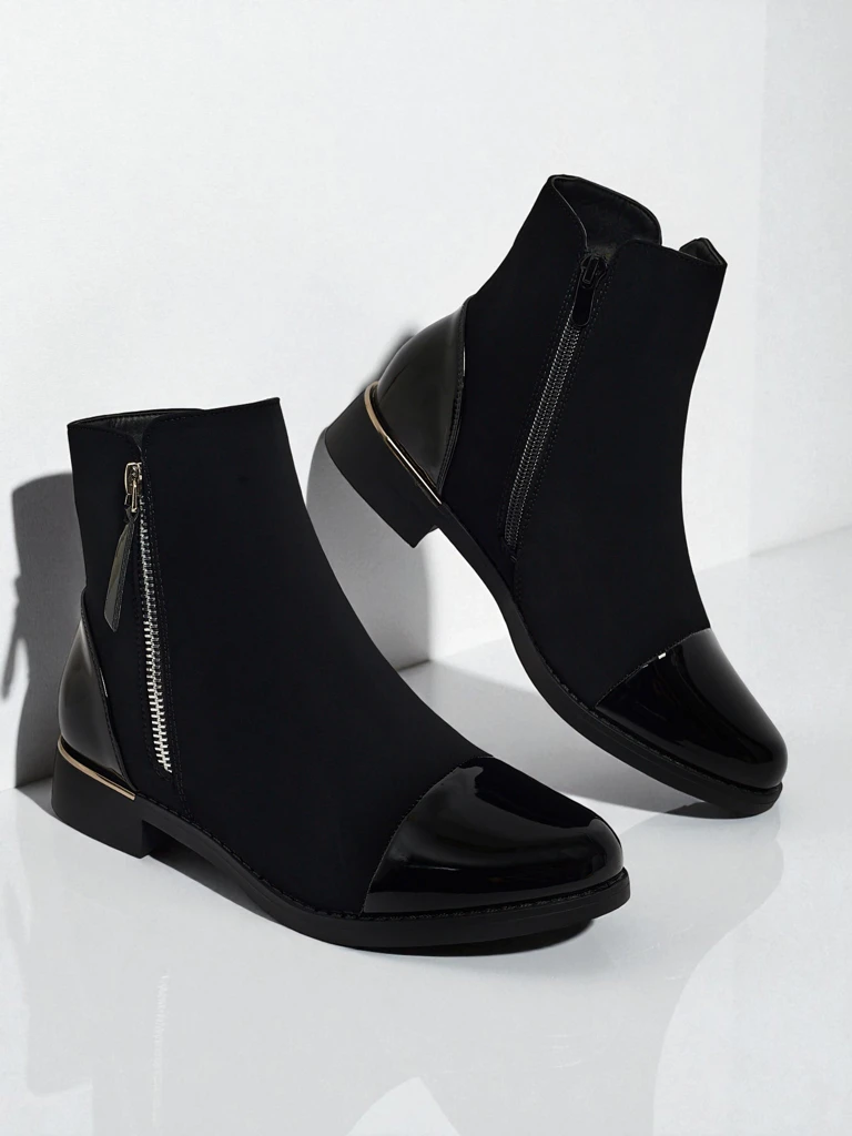 • Fantastic women's ankle boots on a thicker sole, made of a combination of patent and matte eco-leather. The delicate fleece interior guarantees warmth on colder days. The model fastens with a zipper.