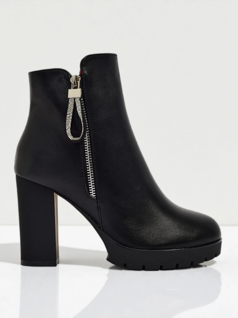 Made of high-quality ecological leather, the ankle boots are characterized by careful finishing. Equipped with a solid zipper, they make it easy to put on and take off. Ecological leather makes the shoes attractive in appearance and practical at the same time. The 10 cm high block heel ensures stability and wearing comfort.