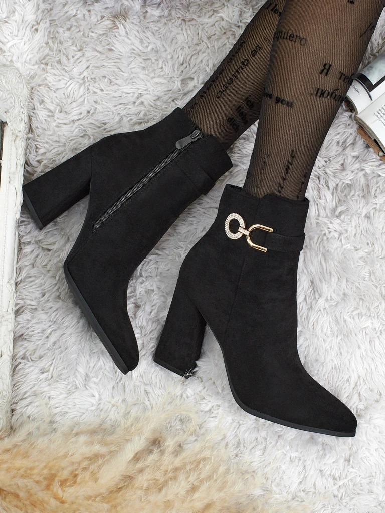 - Gorgeous heeled ankle boots, made of eco-suede leather. The model is fastened with a zipper. The model is gently insulated with fur and has a decoration with zircons on the side of the upper. The perfect choice for autumn!