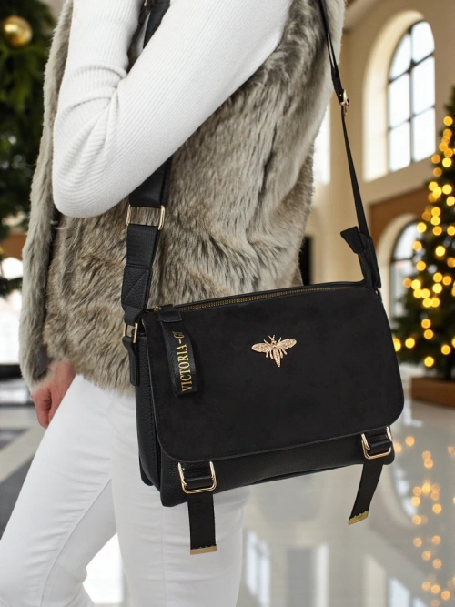 - Small handbag made of a combination of eco-leather and eco-suede. 3 compartments, 4 pockets, zipper and adjustable strap. Style and functionality in perfect edition.