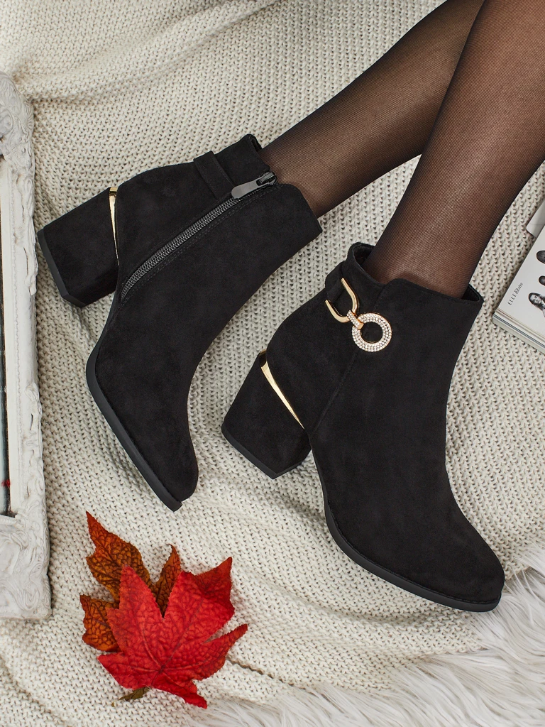 - Gorgeous ankle boots with a block heel, made of eco-suede leather. The model fastens with a zipper. The model is gently insulated with fur and has a decoration on the side of the upper. An ideal choice for autumn!
