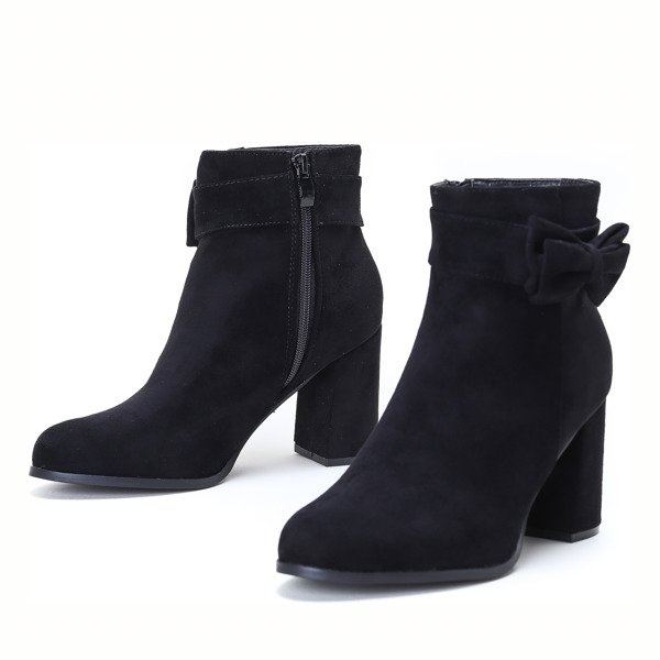 - Sensational boots on the post made of ecological chamois leather. They have a decorative bow on the side of the upper. The model is fastened with a zipper. Inner insulation in the form of fur. The perfect addition to any fall / winter outfit!