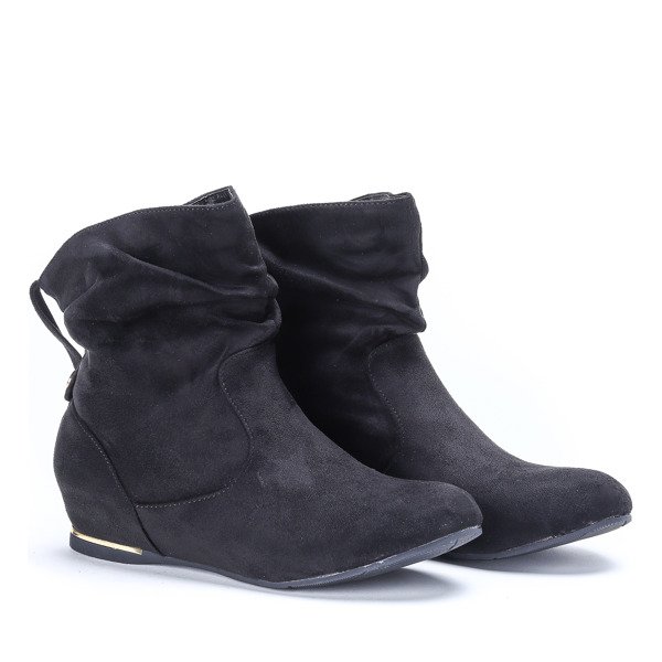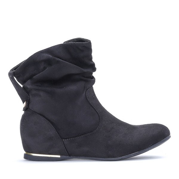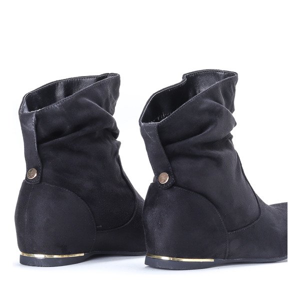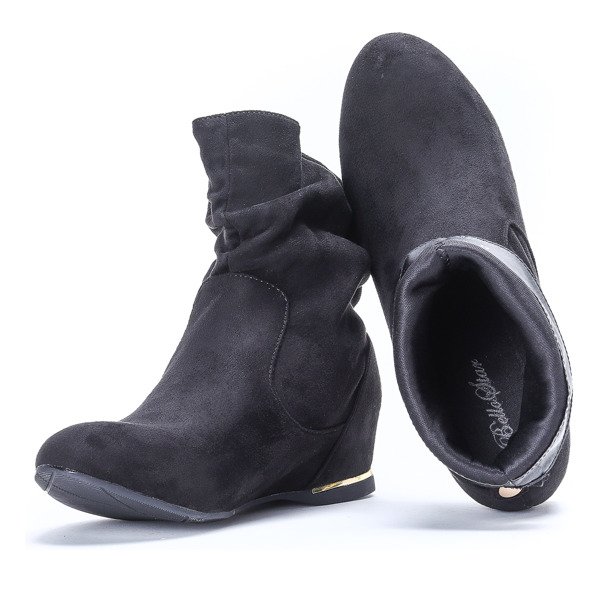- Incredibly comfortable boots on covered heel. The upper is made of eco-friendly suede. Inside they have a delicate warming in the form of foam covered with fabric. The sole decorated with gold trim on the back. Slip-on model, without a clasp.