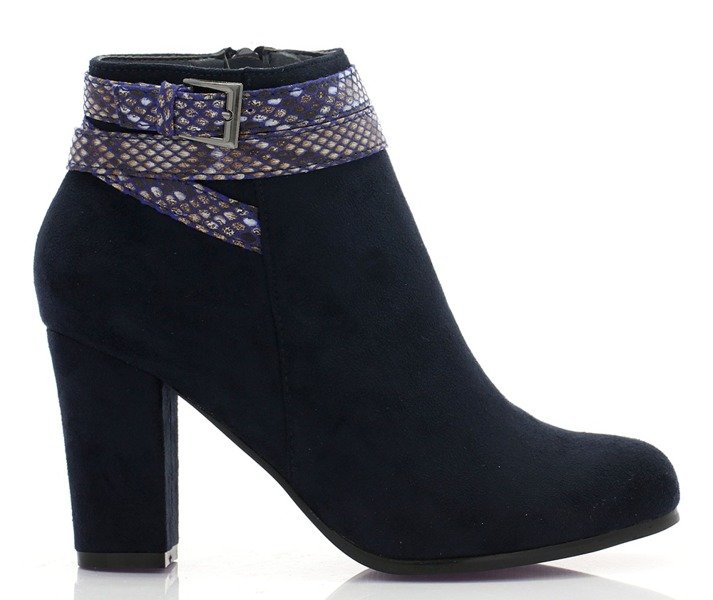 - Rewelacyjne botki na stabilnym słupku wykonane z eko-zamszu. Model zasuwany na suwak. Bardzo wygodne i solidnie wykonane. W środku delikatne ocieplenie. Cholewka zdobiona paskiem z klamrą imitującym skórę węża.