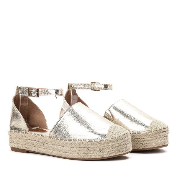 - Niezwykłe espadryle na grubej platformie w kolorze złotym, wykonane z ekologicznej skóry. Wkładka pokryta tkaniną. Podeszwa obuwia pokryta plecionym sznurkiem jutowym. Rewelacyjne buty damskie przełamią każdą wiosenno-letnią stylizację!