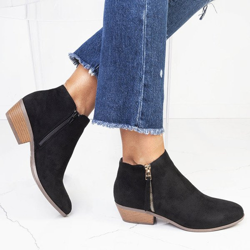 • Klasyczne kowbojki na płaskim obcasie. Materiał wykonania cholewki to eko-zamsz w czarnym kolorze. Wkładka pokryta eko-skórą. Obuwie jest zapinane na suwak po wewnętrznej stronie. Botki posiadają ozdobny złoty zamek. Idealne do codziennej garderoby.
