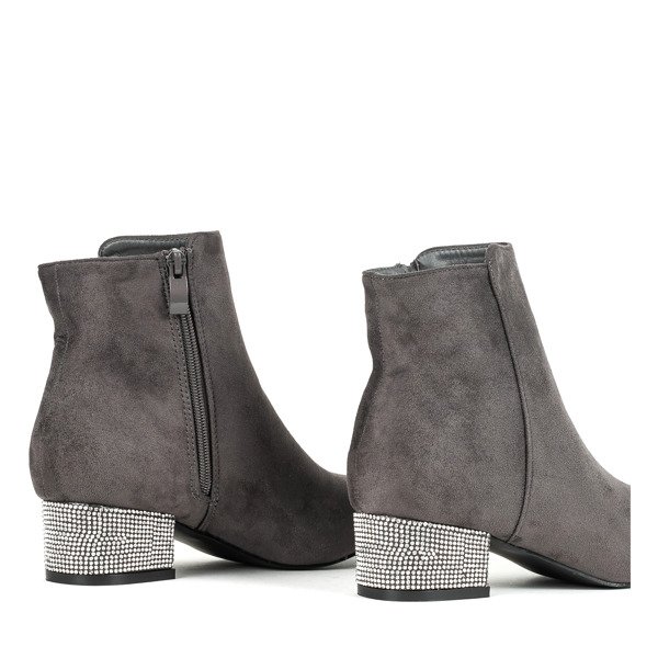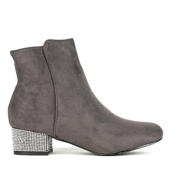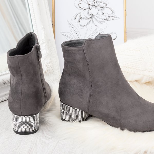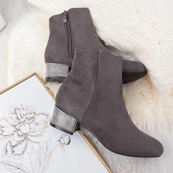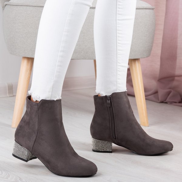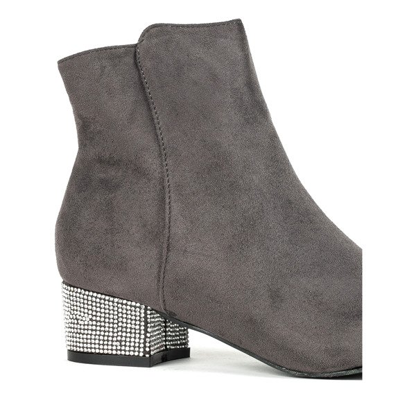 - Stylowe botki damskie na niskim słupku w kolorze szarym. Cholewka wykonana z miękkiego zamszu ekologicznego. Obcas pokryty drobnymi cyrkoniami. W środku posiadają delikatne ocieplenie w formie pianki. Idealnie dopełnią jesienne-zimowe stylizacje!