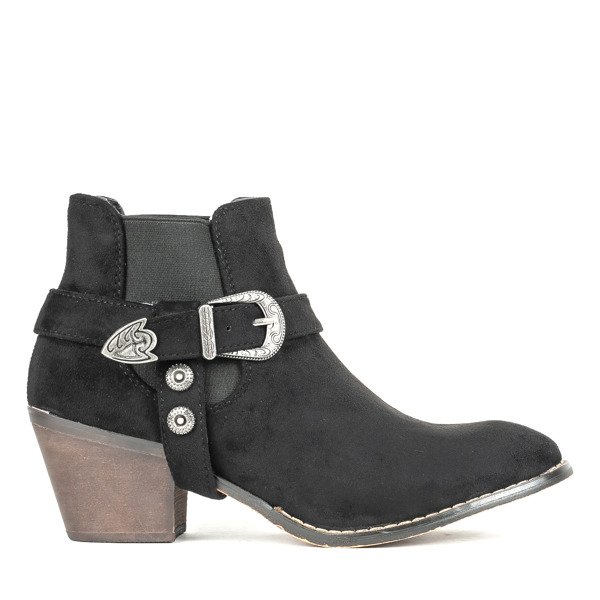 • Czarne botki a'la kowbojki na niskim słupku wykonane ze skóry ekologicznej zamszowej. Model wsuwany - nie posiada zapięcia. Po boku ozdobna sprzączka. Buty damskie nie posiadają dodatkowego ocieplenia.