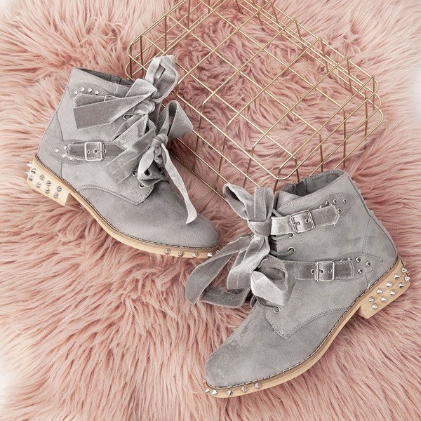 - Workery na płaskim obcasie w szarym kolorze. Zapinane na suwak oraz sznurowane. Cholewka wykonana z materiału eko zamszowego. Dodatek w formie ćwieków i kokard czyni je unikatem wśród butów. Solidnie wykonane. Pasują do wielu stylizacji.