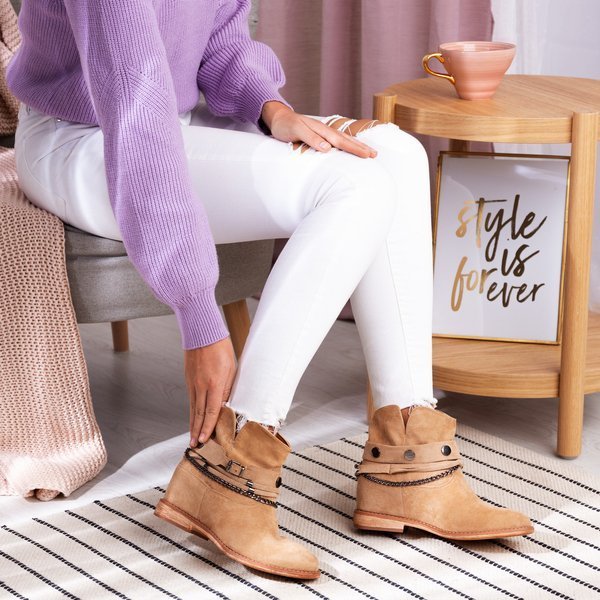 • Botki w stylu kowbojek na krytym koturnie. Materiał wykonania to eko-zamsz w beżowym kolorze. Środek buta jest ocieplony futerkiem. Obuwie posiada ozdoby, które można ściągnąć. Doskonałe do codziennej garderoby!