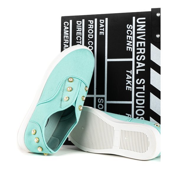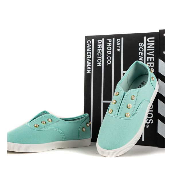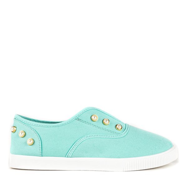 - Damskie slip on z materiału tkaninowego w kolorze miętowym. Cholewka wykończona ozdobnymi perełkami. Solidnie wykonane i bardzo wygodne dzięki miękkiej, gumowej podeszwie. Pasują do wielu codziennych stylizacji.
