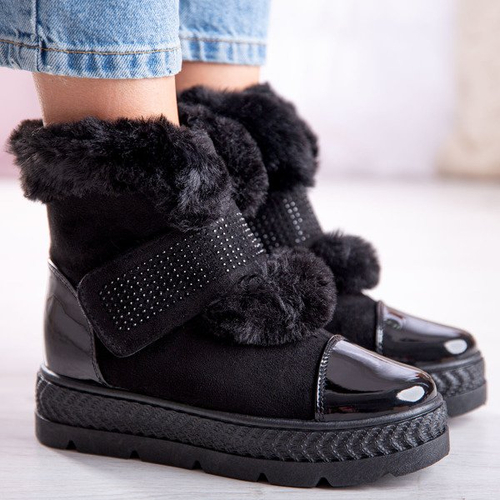 - Czarne botki na platformie. Materiał wykonania cholewki to eko-zamsz w czarnym kolorze. Dodatkowo nosek oraz tylna część cholewki posiada wstawki z lakierowanej eko-skóry. Środek ocieplony futrem. Wygodne zapięcie na rzepy. Pasek ozdobiony cyrkoniami.
