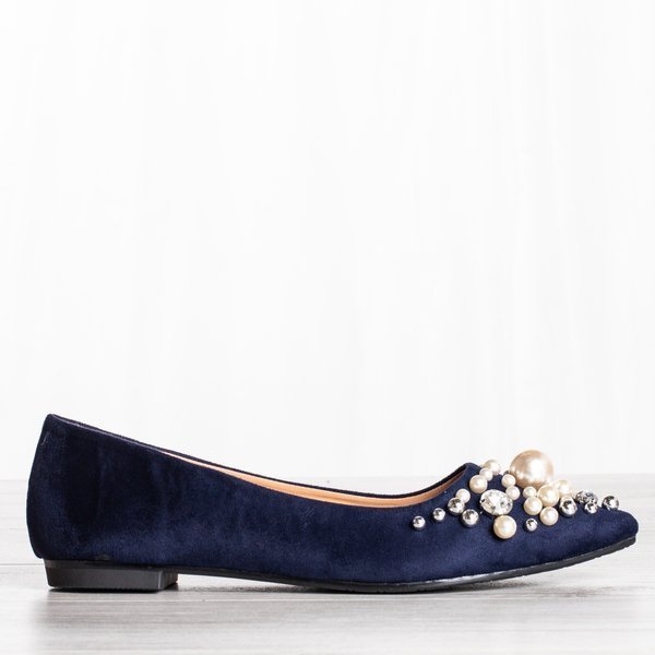 - Wyjątkowo eleganckie damskie balerinki wykonane z ekologicznego zamszu w kolorze granatowym. Wkładka pokryta skórą ekologiczną. Zwężany nosek jest wykończony ozdobnymi perełkami oraz cyrkoniami. Stanowią idealne dopełnienie do wiosenno-letnich stylizacji!