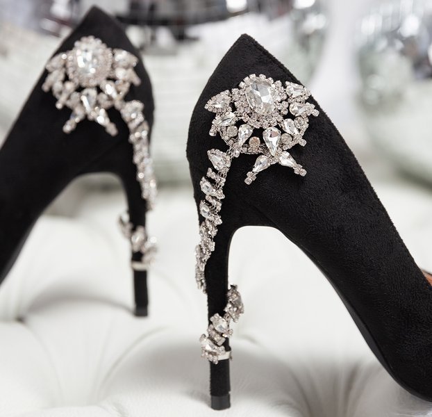 - Eleganckie szpilki z noskiem do szpica. Cholewka wykonana z eko-zamszu w czarnym kolorze. Środek buta wyłożony eko-skórą. Obcas oraz tylna część buta ozdobiona cyrkoniami. Efektowny dodatek do kreacji!