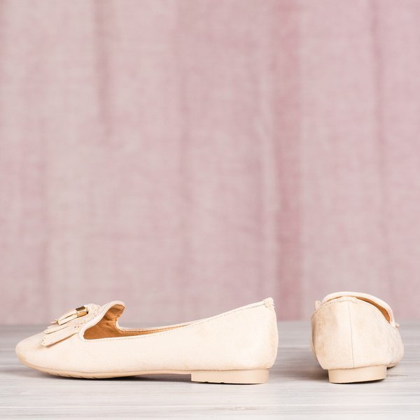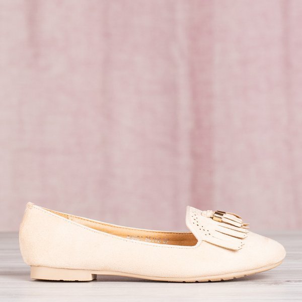 - Lekkie mokasyny wykonane ze skóry ekologicznej zamszowej. Model w kolorze beżowym. Na nosku ozdobne frędzelki. Wkładka ze skóry ekologicznej. Idealne na cieplejszą porę. UWAGA: Model może posiadać klej na podeszwie.