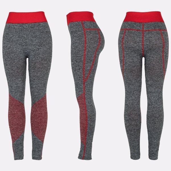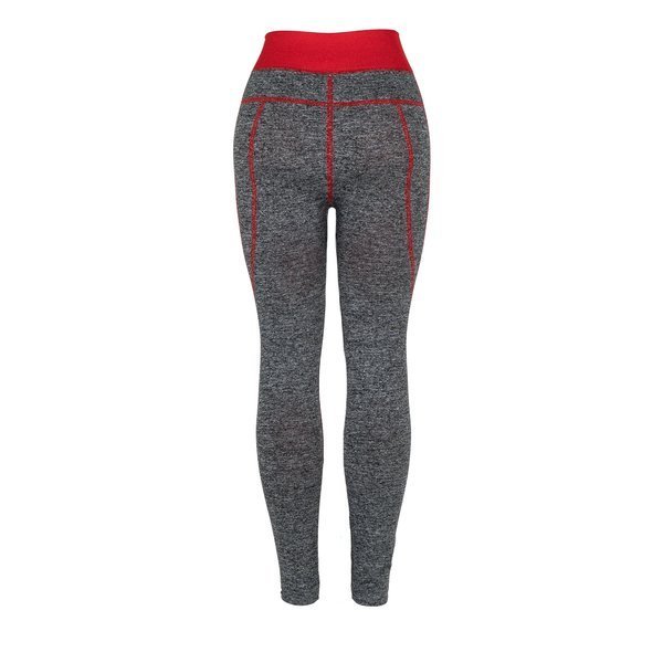 • Elastyczne getry wykonane z grubej tkaniny. Legginsy mają szary kolor i posiadają czerwone wstawki. Prezentowana odzież może służyć jako sportowa bielizna pod odzież wierzchnią. UWAGA: Dokładność pomiaru (+/-) 1 cm.