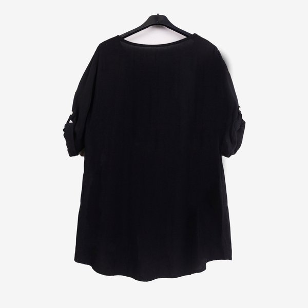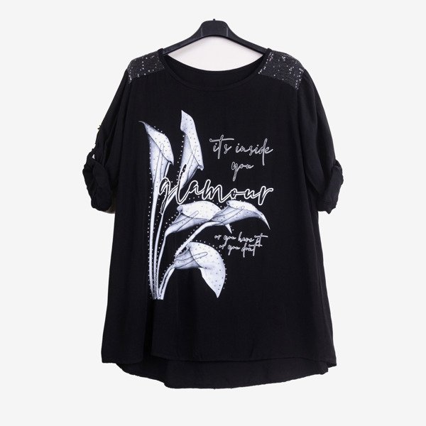 - Damska tunika oversize wykonana z wiskozy. Rękawy posiadają zapięcie na guzik. Model zdobiony nadrukiem w kwiaty, napisami oraz cyrkoniami. Idealna na lato!