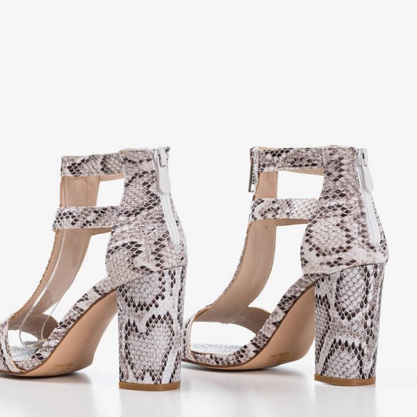 • Stylowe sandały na wyższym słupku wykonane ze skóry ekologicznej w wężowy wzór, wkładka - eko-skóra. Z przodu model posiada ozdobny, srebrny suwak. Obuwie damskie zapinane na zamek z tyłu. Sprawdzą się do eleganckich stylizacji.
