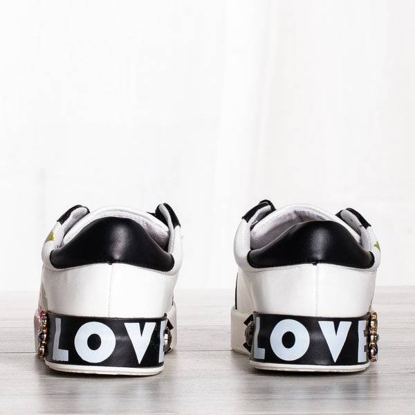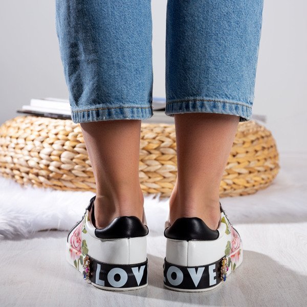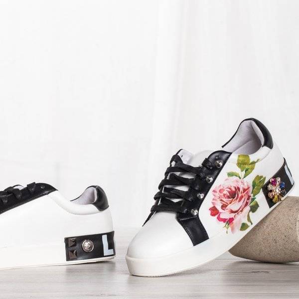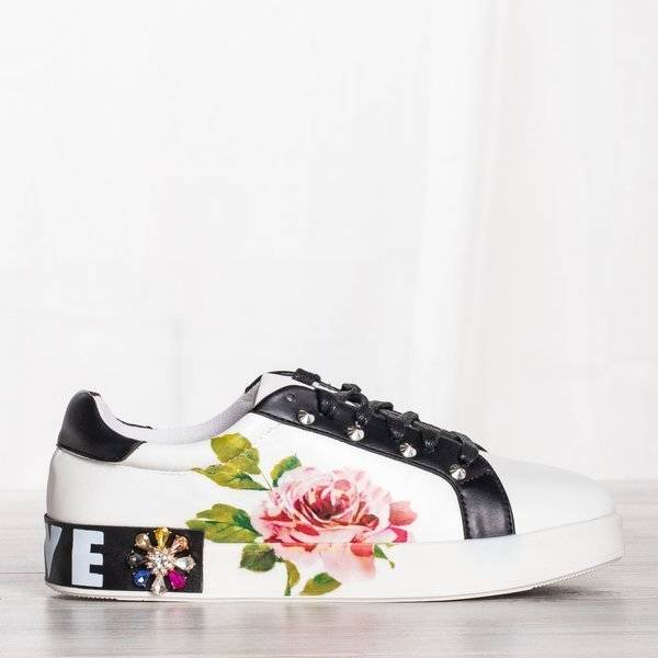 - Sportowe buty damskie z printem róży. Materiał wykonania to eko-skóra w białym kolorze. Środek buta wyłożony tkaniną. W tylnej części buta napis LOVE. Dodatkowo ćwieki i cyrkonie. Uwaga: produkt posiada zarysowania na materiale.