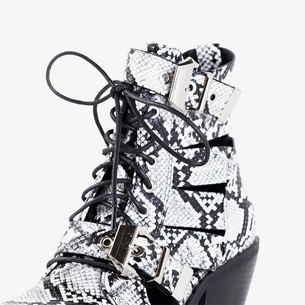 - Funky sieviešu kovboju zābaki ar krāsainu čūskas ādas reljefu. Virspusē ar izgriezumiem, ir 2 dekoratīvas sprādzes. Modelis izgatavots no ekoloģiskas ādas, bez izolācijas. Tie būs ideāls papildinājums jūsu mētelim!