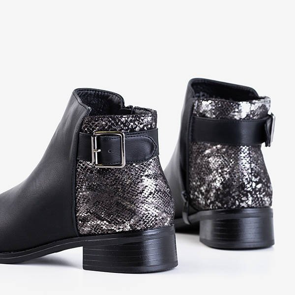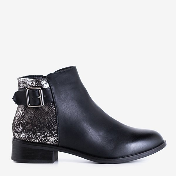 - Oryginalne damskie botki na płaskim obcasie w kolorze czarnym. Cholewka wykonane ze skóry ekologicznej, w tylnej części posiada tkaninową wstawkę, która zdobiona jest printem a'la skóra węża. Model zapinany suwakiem po boku.