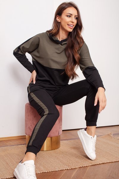 Czarno-zielony damski komplet dresowy z lampasami - Odzież