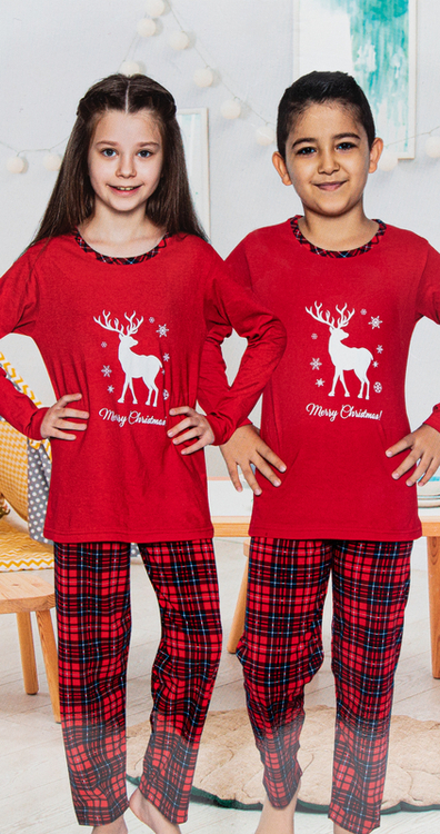 • Divdaļīga bērnu sarkana pidžama, izgatavota no 100% mīkstas kokvilnas. Modeli rotā Ziemassvētku apdruka, rūtainas bikses, blūze ar ziemeļbriežu. Šis modelis ir lieliska Ziemassvētku dāvana! PIEZĪME: Mērījumu precizitāte (+/-) 1 cm.