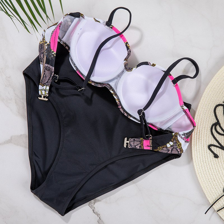 • Lapu raksta peldkostīms, ārkārtīgi moderns. Bikini ir ar augstu vidukli, tērpa augšdaļa aizdarāma ar spiedpogu, siksnas ir regulējamas. Push-up krūšturis PIEZĪME: Mērījumu precizitāte (+/-) 1 cm.