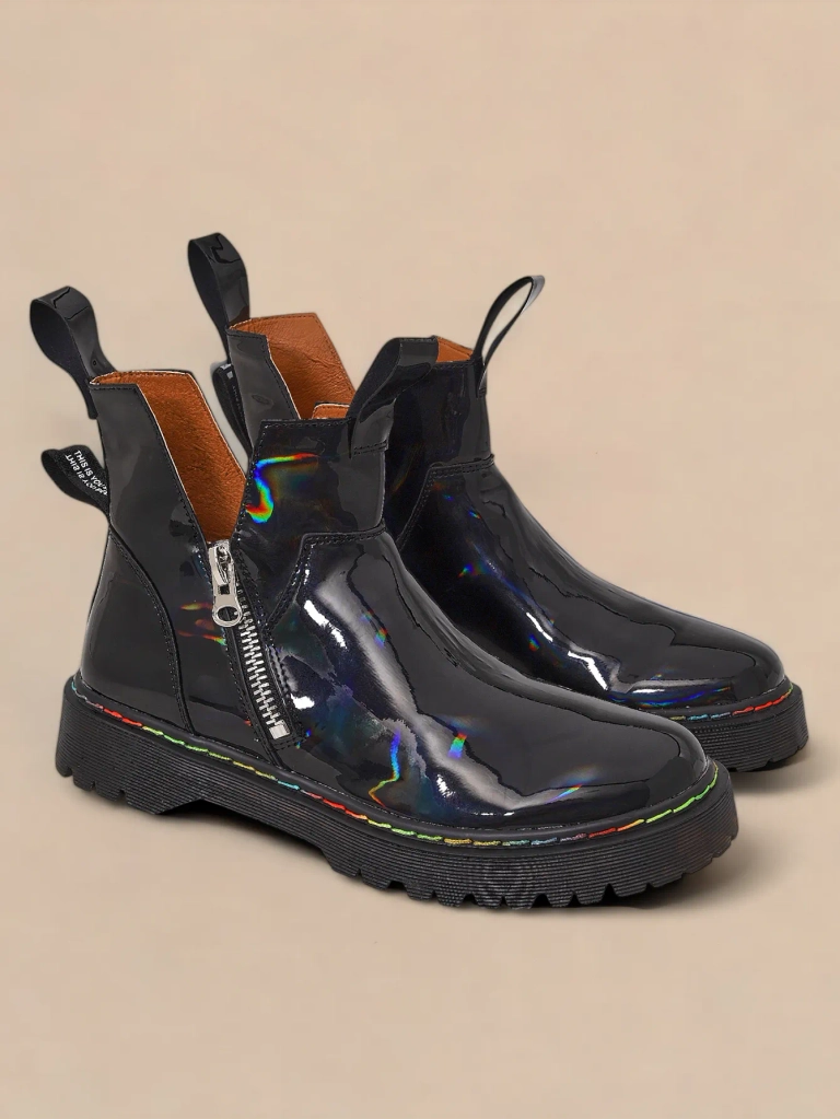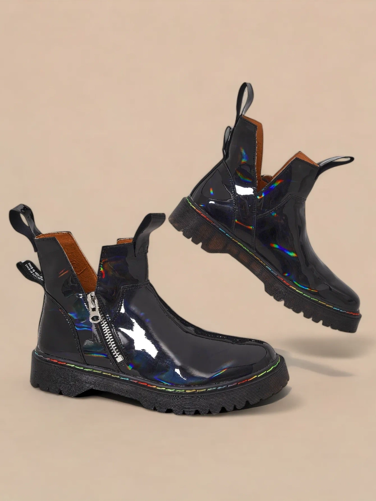 • Sieviešu zābaki no gumijas materiāla un eko ādas kombinācijas ar hologrāfisku motīvu. Modelis bez siltinājuma, iekšzole oderēta ar eko ādu. Sānos izgriezumi un rāvējslēdzēja aizdare. Ideāli sieviešu apavi vēsākām dienām!