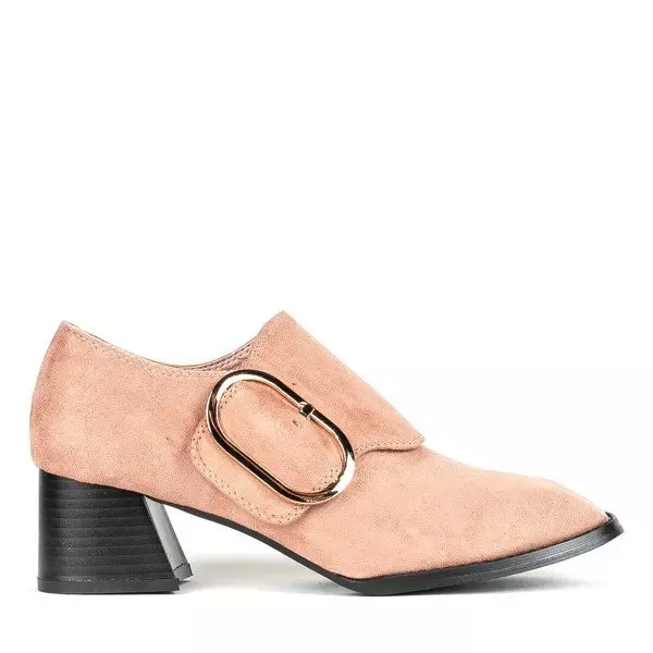 - Stylowe półbuty na niskim słupku z kwadratowym noskiem. Materiał wykonania obuwia to eko-zamsz w różowym kolorze. Wnętrze buta wyłożone eko-skórą. Obuwie damskie posiada wygodne zapięcie na rzep, ozdobione złota klamrą. Doskonałe do eleganckiej garderoby.