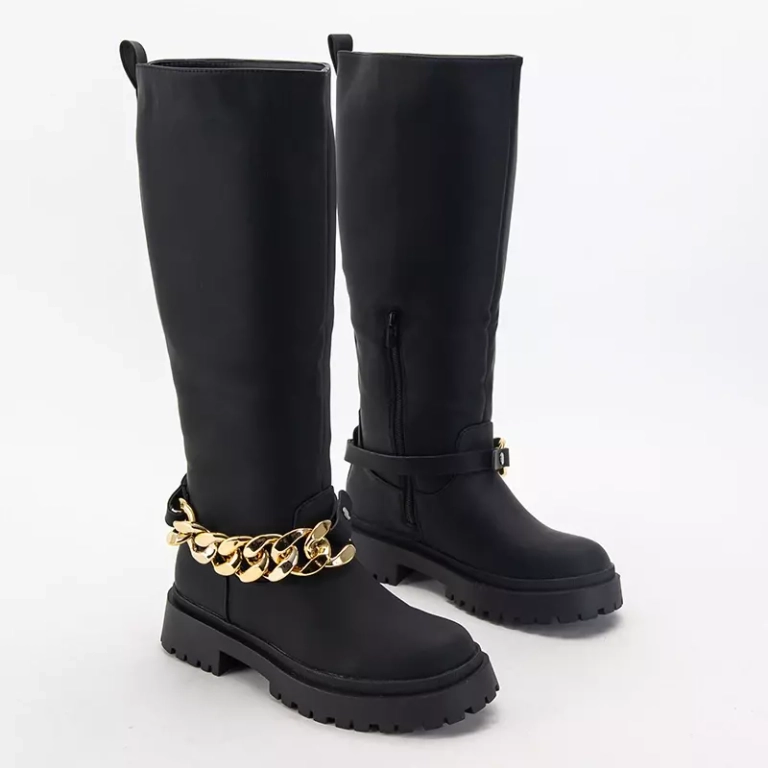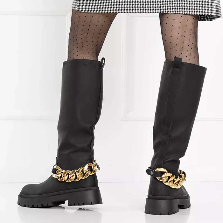 - Sieviešu zābaki līdz ikru vidum no ekoloģiskas ādas. Uzvelkams un daļēji rāvējslēdzējs. Plakanpapēžu modelis ar dekoratīvu biezu ķēdīti augšpusē. Piezīme: izstrādājumam trūkst dažu dekorāciju.