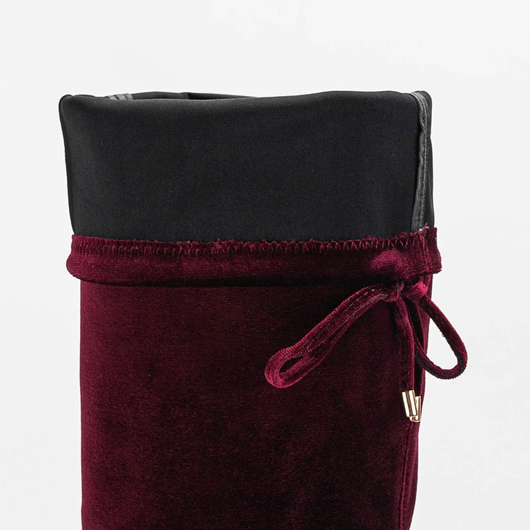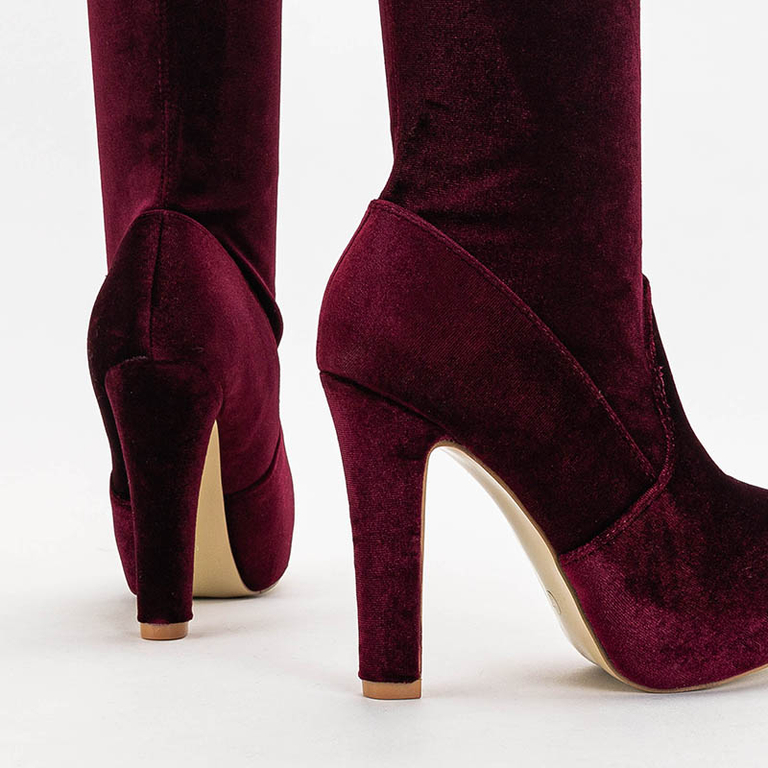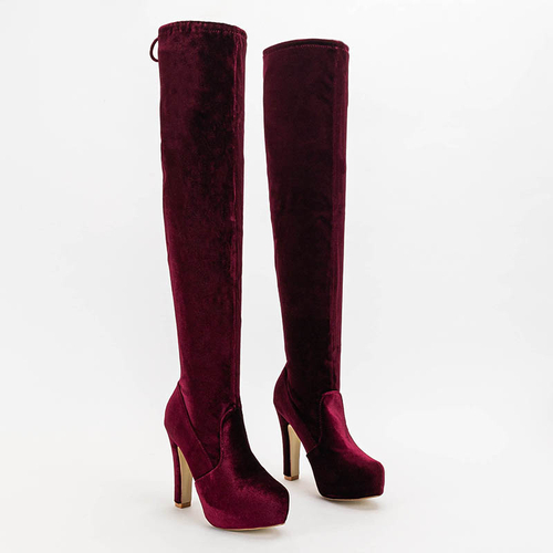 - Stilīgi augstpapēžu zābaki ar augstu papēdi un platformu. Augšdaļa no velūra, un to augšdaļā ir siksna. Mandeļu pirkstgalu, zole izgatavota no auduma. Lieliski piemērotas vakara izbraucieniem pie elegantiem tērpiem!
