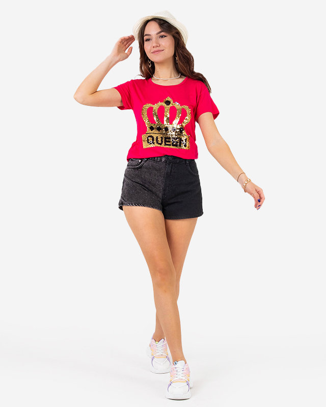 Fuksijas krāsas sieviešu t-krekls ar vainagu un fliteriem - Apģērbs