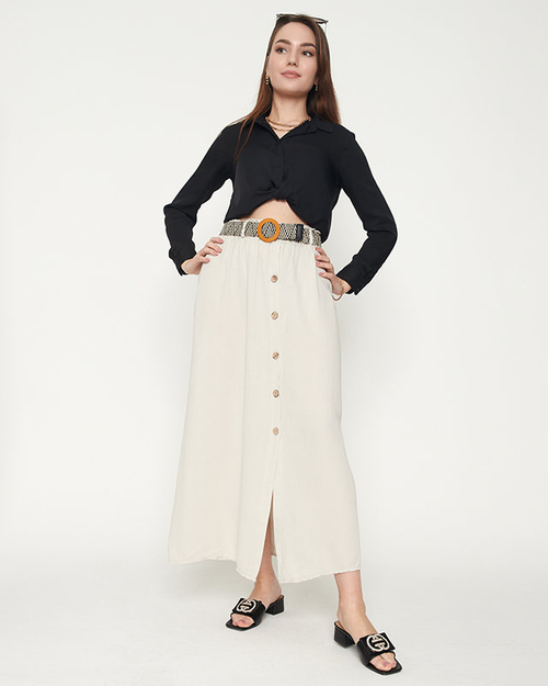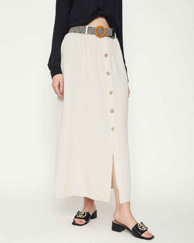 • Sieviešu midi garuma svārki no patīkama kokvilnas materiāla. Viduklī elastīga gumija un pīta josta. Modelis ar pogām. PIEZĪME: Mērījumu precizitāte (+/-) 1 cm.