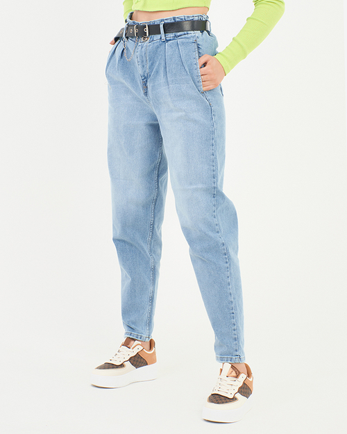 - Stilīgi sieviešu mom džinsi, izgatavoti no kokvilnas materiāla. Modelim ir: - augsta jostasvieta, - pogas un rāvējslēdzēja aizdare, - 4 kabatas, - josta 100 cm gara un 3 cm plata PIEZĪME: Mērījumu precizitāte (+/-) 1 cm.