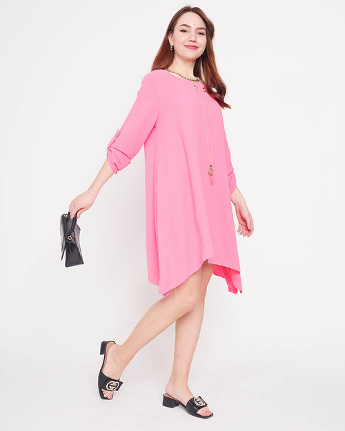 - Vienkārša sieviešu minikleita, no viegla poliestera auduma. Modelis ar apaļu kakla izgriezumu, kas dekorēts ar zelta ķēdīti, un garām piedurknēm ar iespēju tās uzlocīt. PIEZĪME: Mērījumu precizitāte (+/-) 1 cm.