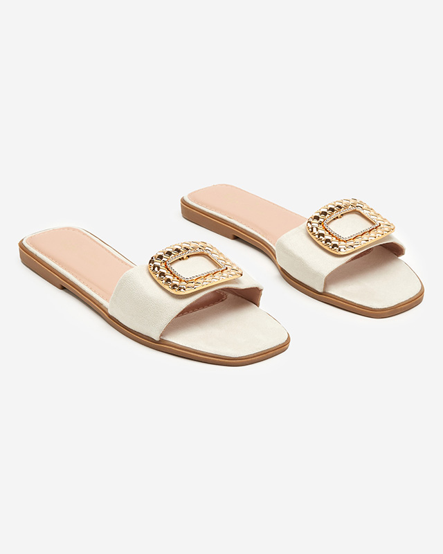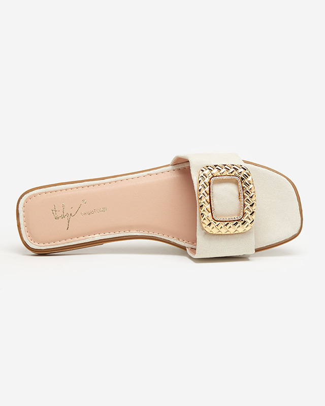 Bēšas sieviešu eko zamšādas čības ar zelta sprādzi Lozi - Apavi