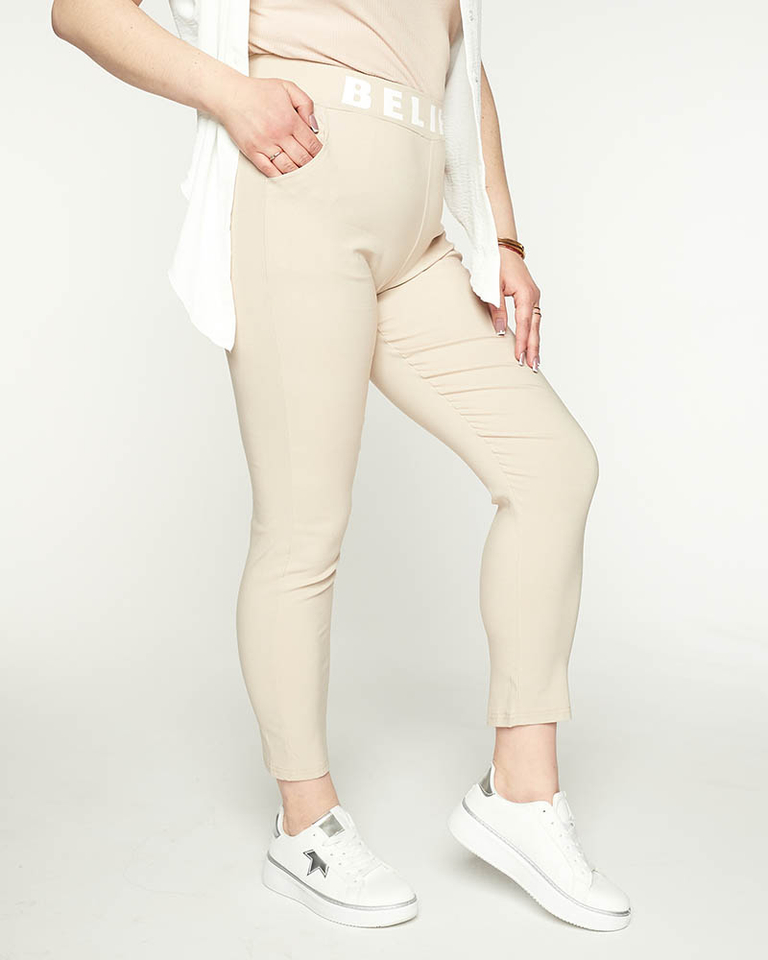 - Modes sieviešu auduma bikses ar elastīgu jostasvietu un kabatām priekšpusē. Modelis ar augstu jostasvietu ar uzrakstu jostasvietā. Ideāls pamats daudziem ikdienas izskatiem! PIEZĪME: Mērījumu precizitāte (+/-) 1 cm.