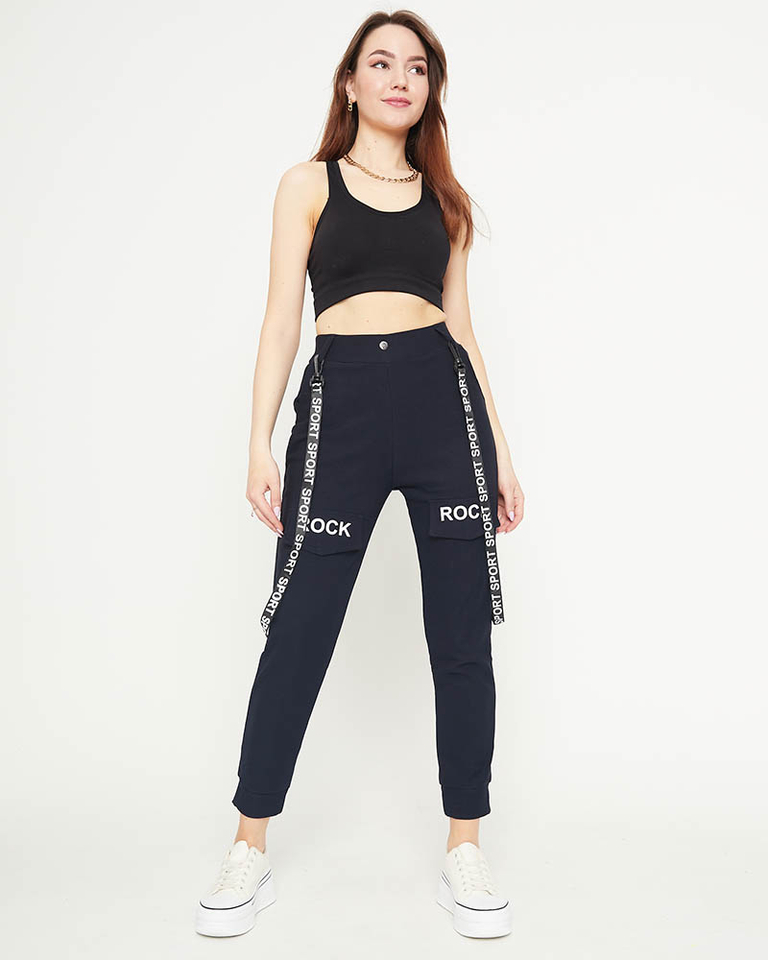 • Unikālas sieviešu kravas bikses no elastīga auduma. Modelim ir elastīga jostasvieta, divas slip kabatas un divas dekoratīvas ar uzrakstiem. Turklāt pie biksēm ir piestiprināti dekoratīvi zeķturi. PIEZĪME: Mērījumu precizitāte (+/-) 1 cm.