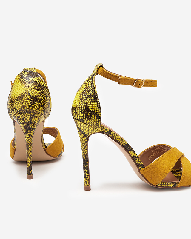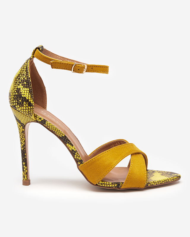 • Elegantas sieviešu sandales uz augsta papēža, izgatavotas no ekoloģiskas zamšādas un eko-ādas kombinācijas ar reljefu. Produkts aiztaisāms ar sprādzi potītes līmenī, ir iekšzolīte no ekoloģiskas ādas.
