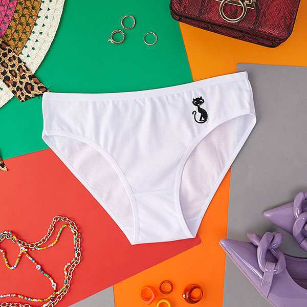 Baltas kokvilnas sieviešu biksītes ar izšūtu kaķēnu - Apakšveļa