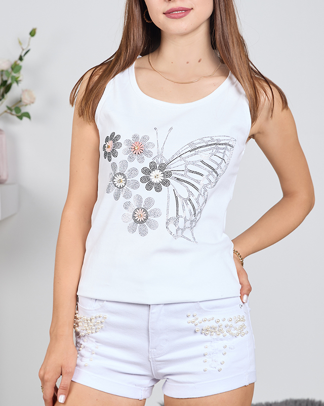 - Skaists sieviešu tops ar platām lencēm, no kokvilnas auduma. Priekšpuse ir dekorēta ar tauriņu un ziediem ar kubisko cirkoniju. Lieliski piemērots modernu vasaras tērpu veidošanai! PIEZĪME: Mērījumu precizitāte (+/-) 1 cm.