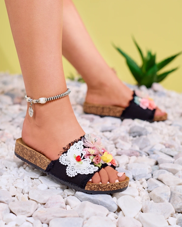 Sieviešu čības ar auduma ziediem melnā krāsā Ososi- Footwear