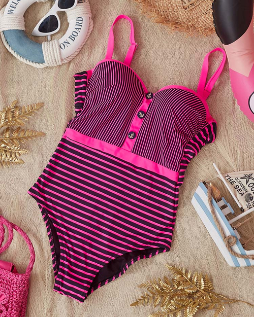 - Fantastisks sieviešu svītrains peldkostīms, dekorēts ar pogām. Modelis ar stingrām krūzītēm un push-up, sasienamu muguru un regulējamām lencēm. Man jābūt tavā koferī atvaļinājuma laikā! PIEZĪME: Mērījumu precizitāte (+/-) 1 cm.