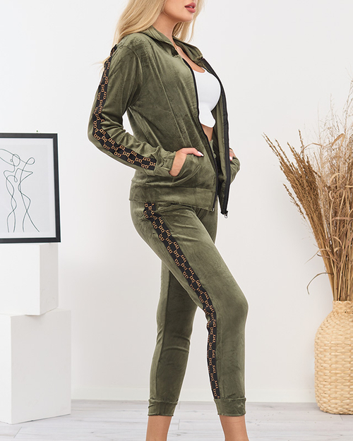 - Modes sieviešu sporta kreklu komplekts no a la velūra materiāla. Džemperis aiztaisāms ar rāvējslēdzēju, ar kapuci un divām kabatām. Bikses ar elastīgu jostasvietu un kabatām priekšpusē. Produkts ir dekorēts ar svītrām. PIEZĪME: Mērījumu precizitāte (+/-)